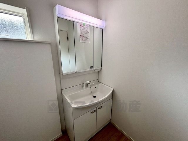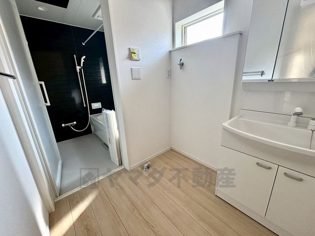 洗面台、洗濯機置き場、バスルームが連なっている、生活導線の考えられた作りになっています。