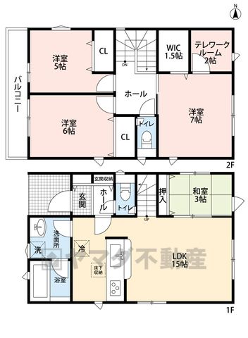 LDK15畳(1F)、洋5畳(2F)、洋6畳(2F)、洋7畳(2F)、和3畳(1F) |
