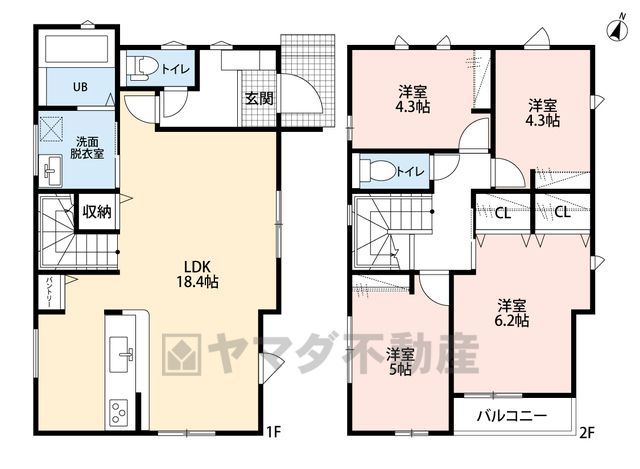 LDK18.4畳(1F)、洋4.3畳(2F)、洋5畳(2F)、洋6.2畳(2F) |