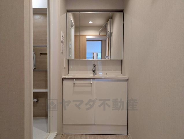 三面鏡にハンドシャワー付きで使いやすい洗面台です^^鏡裏と洗面ボウル下に収納付きの洗面台なので、整理整頓ができスッキリと使えます^^