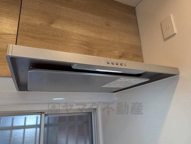 換気扇 風量が弱・強と切替え可能なレンジフードが調理中の煙をしっかり吸い込みます。手元を照らすライト付きです。