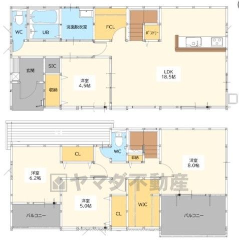 LDK18.5畳(1F)、洋4.5畳(1F)、洋8畳(2F)、洋6.2畳(2F)、洋5畳(1F) |