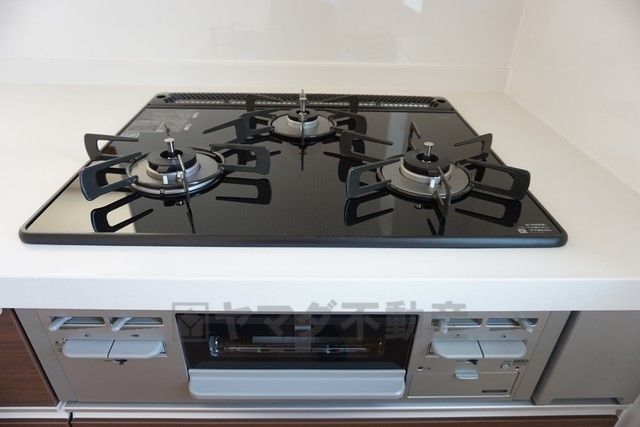 同仕様写真。現況と異なる場合は現況優先です。 3種類の料理が同時に調理できる、3口ガスコンロ。忙しい夕食の支度時間が短縮できて効率よくお料理が楽しめます。