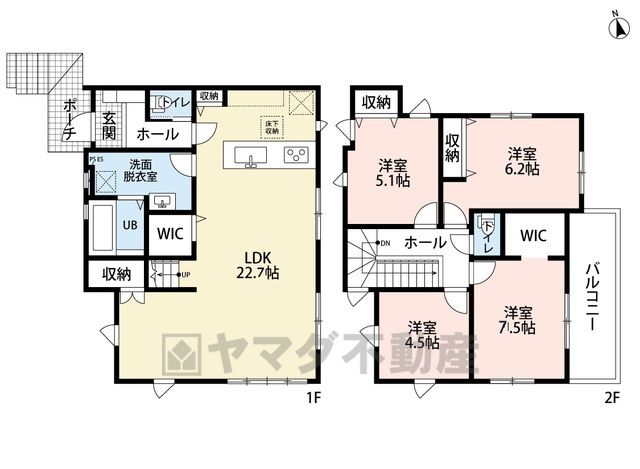 LDK22.9畳(1F)、洋6.8畳(2F)、洋5.4畳(2F)、洋5.2畳(2F)、洋5.5畳(2F) |