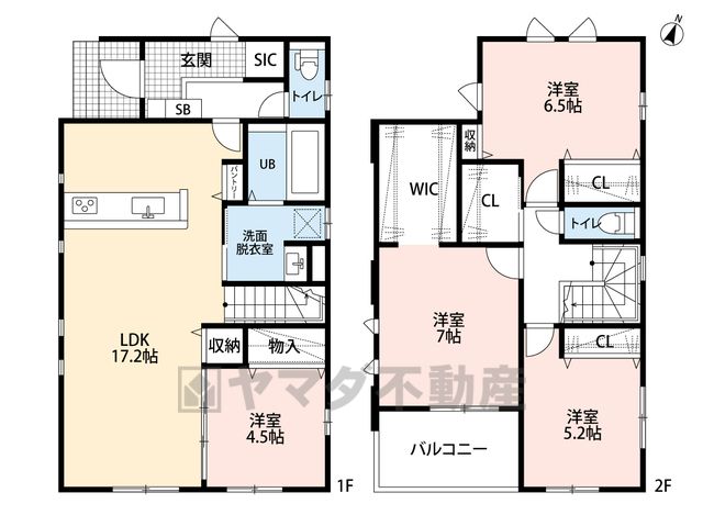 LDK17.2畳(1F)、洋4.5畳(1F)、洋5.2畳(2F)、洋6.5畳(2F)、洋7畳(2F) |