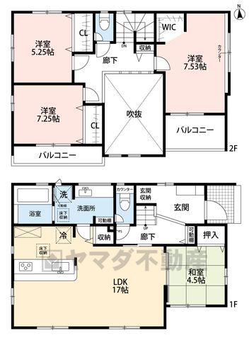 LDK18.3畳(1F)、和4.5畳(1F)、洋7畳(2F)、洋5.2畳(2F)、洋5.4畳(1F) |