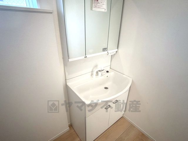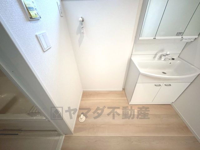 洗面台、洗濯機置き場、バスルームが連なっている、生活導線の考えられた作りになっています。