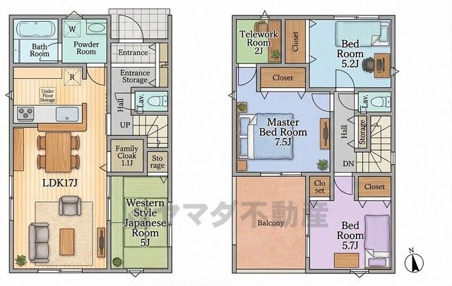 LDK17畳(1F)、和5畳(1F)、洋5.2畳(2F)、洋5.7畳(2F)、S2畳(2F)、洋7.5畳(2F) |