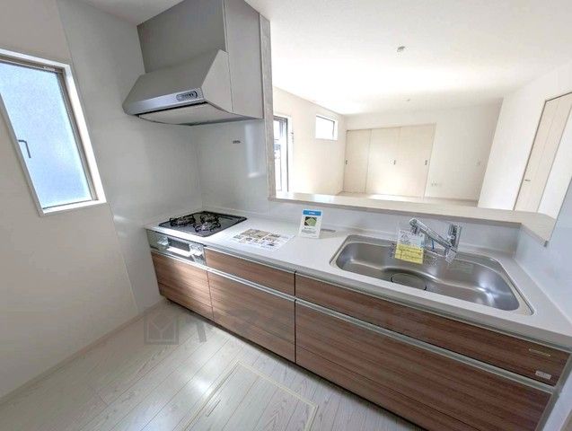 パントリー付き。収納も、作業スペースも広々と設けられた使いやすいシステムキッチンです。カウンターキッチンなので、ご家族と会話をしながら楽しくお料理ができます。