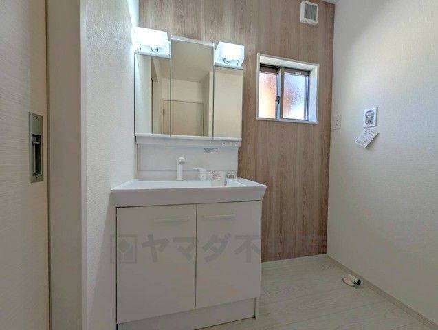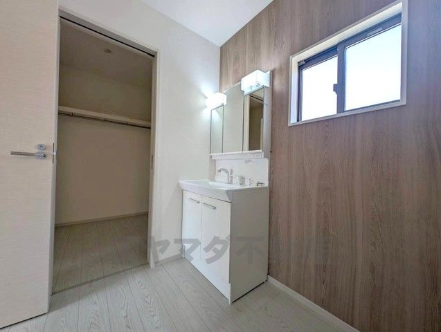 洗面台、洗濯機置き場、バスルームが連なっている、生活導線の考えられた作りになっています。FCLが隣にあるので家族のお洋服収納にも困りません^^