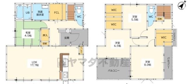 LDK17.7畳(1F)、和4.5畳(1F)、洋8畳(2F)、洋6.5畳(2F)、洋5.5畳(2F) |