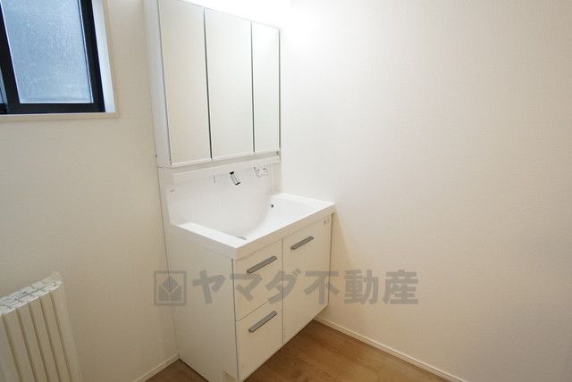 三面鏡裏収納付き洗面化粧台です^^ 歯磨きセットやスキンケア用品などの収納に便利ですね。