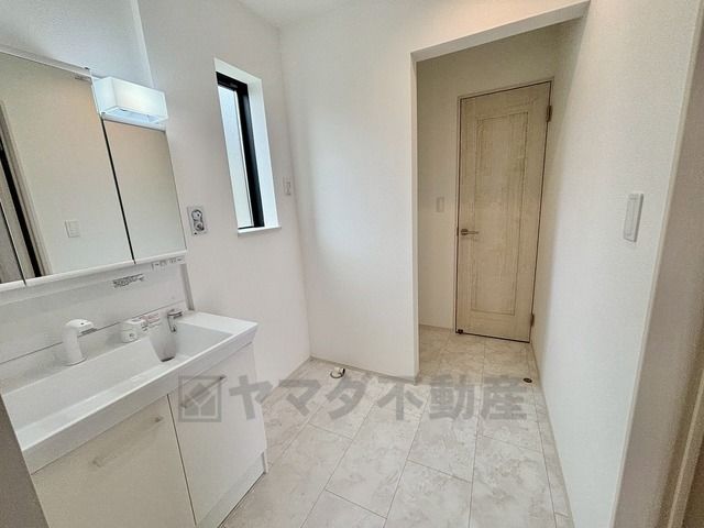 洗面台、洗濯機置き場、バスルームが連なっている、生活導線の考えられた作りになっています。