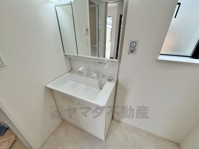 三面鏡にハンドシャワー付きで使いやすい洗面台です^^鏡裏と洗面ボウル下に収納付きの洗面台なので、整理整頓ができスッキリと使えます^^
