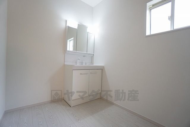 同仕様写真。三面鏡つき洗面台。鏡裏にたっぷりとした収納スペースがあります。鏡を閉めてしまえば小物は見えないため、スッキリとした印象の洗面台にできます。