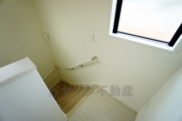 同仕様写真。小さなお子様やご高齢の方でも安心できる、手すり付き階段。段差も低めで設定されており、安全性にも優れています。