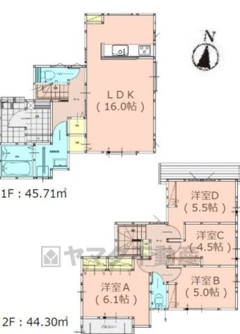 LDK16畳(1F)、洋4.5畳(2F)、洋5畳(2F)、洋5.5畳(2F)、洋6.1畳(2F) |