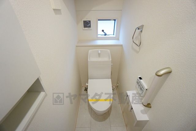 同仕様写真。温水洗浄機付トイレです。節水機能もあるので、安心して使えますね。もちろん、1階2階の2ヶ所にトイレがあるので、忙しい朝にもゆとりができますね。