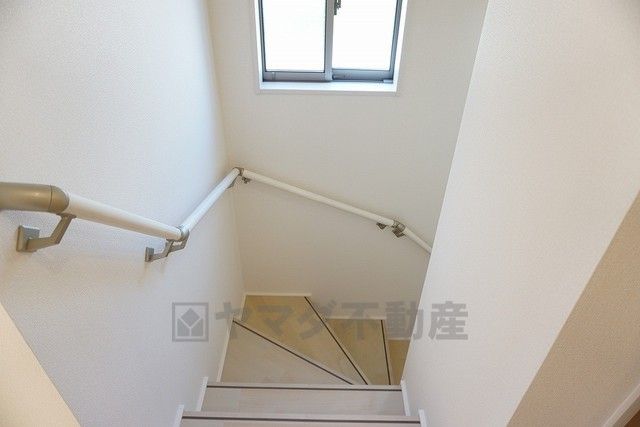 同仕様写真。小さなお子様やご高齢の方でも安心できる、手すり付き階段。段差も低めで設定されており、安全性にも優れています。