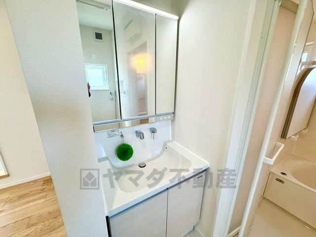 三面鏡にハンドシャワー付きで使いやすい洗面台です^^鏡裏と洗面ボウル下に収納付きの洗面台なので、整理整頓ができスッキリと使えます^^
