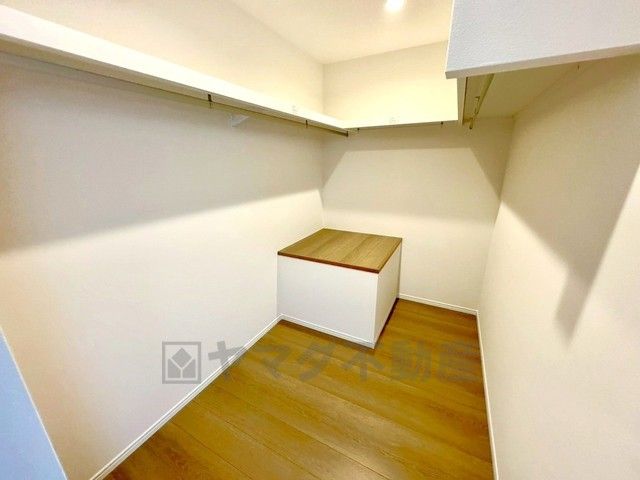 ウォークインクローゼットは奥にハンガーパイプ、手前に可動棚を付け、コートなどのアウター類から帽子や靴下などの小物類まで全て収納できます^^
